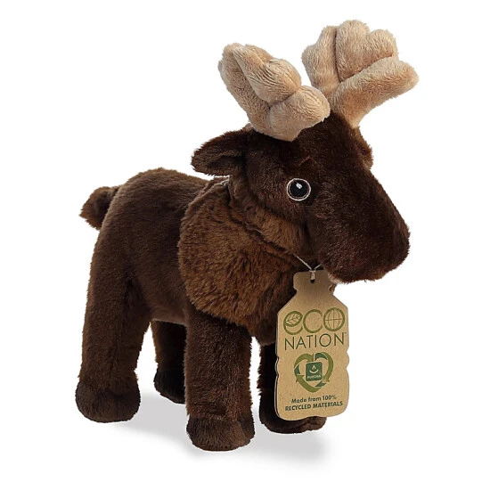 Aurora World's Eco Nation collection expands with 20 new and special animal friends! Eco Nation is our sustainable plush line made from 100% recycled materials Bring home your favorite animal that has an extremely soft, high quality feel made from recycled plastic bottles This Moose is dark brown with plush antlers, has adorable embroidered eyes, and comes with an Eco Nation bottle tag also made from 100% recycled materials