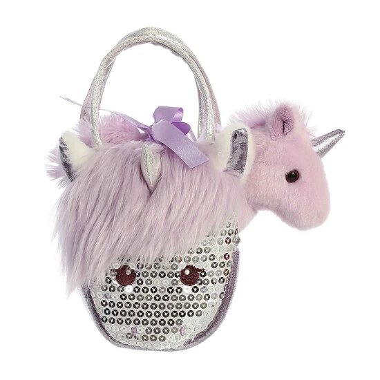 Fancy Pals from Aurora features a wide variety of animals, styles, and colors that are sure to please anyone! This adorable Grape Unicorn bag is made with silver sequins and fluffy lavender detailing. It comes with a cute lavender unicorn. Small and compact, it is perfect for carrying around!