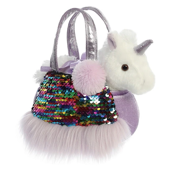 Aurora's Fancy Pals Toy Pet Carriers feature cute animals in a fun and colorful reversible sequin carrier. The unicorn has a white coat and a purple horn. The unicorn comes in a soft carrier with reversible rainbow to silver sequins and a strip of long purple fur at the bottom.