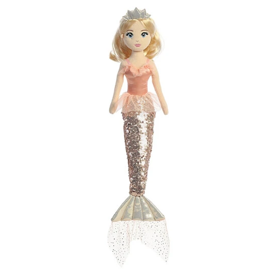 Tutu Sparkles from Sea Sparkles feature an extravagantly designed outfit and sequined tail. Tutu Sparkles Jasmine is rose gold themed. Her blonde hair is up in a ponytail tied with a matching rose gold ribbon.