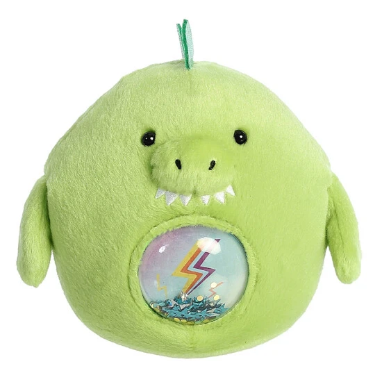 Shakers are Aurora's special collection of interactive plush where their tummies come to life with a globe filled with sparkles and a unique design. This T-rex is a terrific green dino with a tummy featuring a rainbow lightning bolt and multi-colored sparkles.